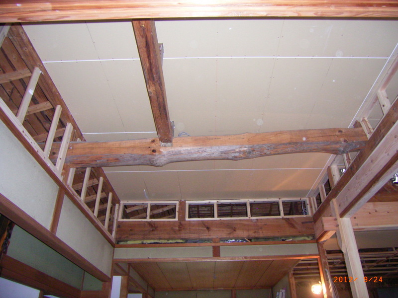 今まで屋根裏に隠れていた2本の太鼓梁を今回天井高を上げて化粧梁として見せます。部屋の雰囲気をガラッと変えてくれるハズです。
