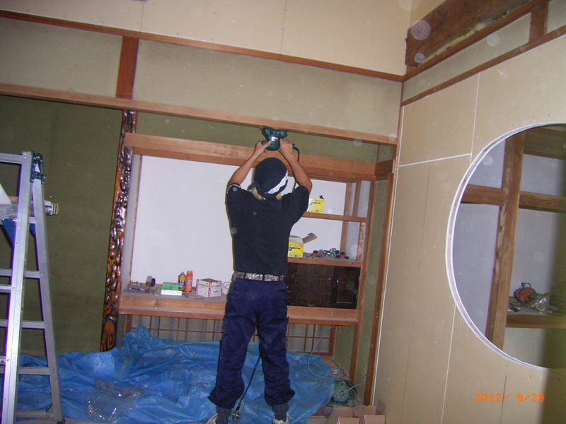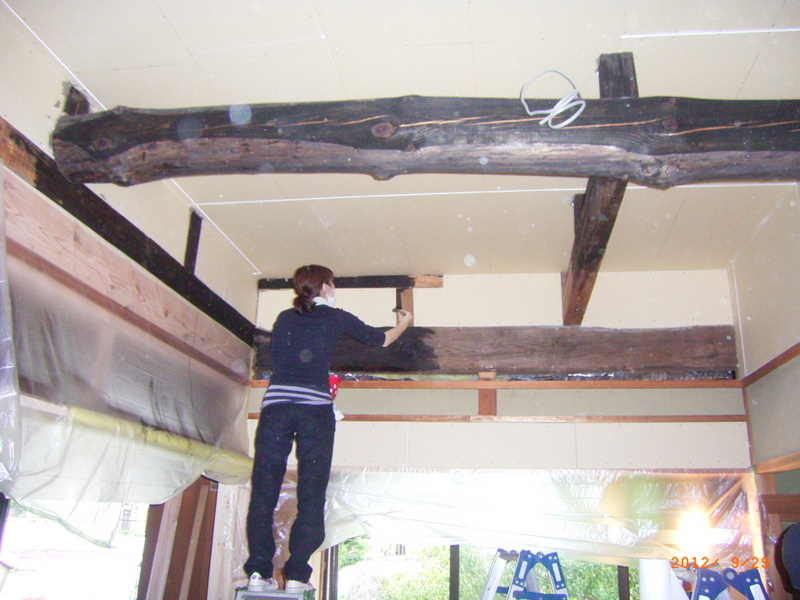 既存の桁、梁、鴨居、長押を研磨しています。研磨されているのはこの家のご主人です。なんと塗装工事はお客様夫婦が施工されました。