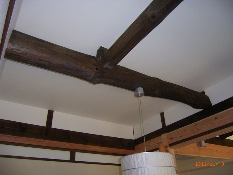 既存の桁、梁、鴨居、長押に墨の塗料を塗っているのはこの家の奥様です。なかなかいい腕してましたよ。きれいに塗れてます。もちろん自然素材を使うため塗料も墨や柿渋などの塗料を使います。
