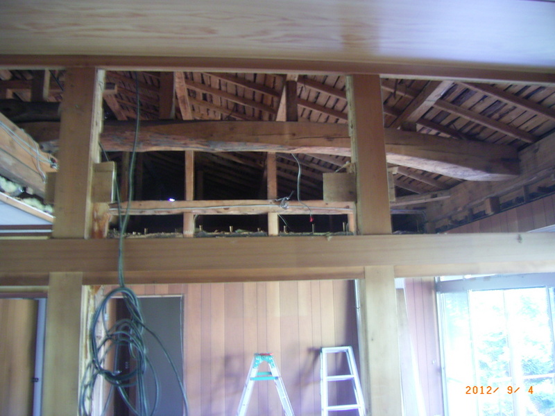 これもまた梁の補強工事です。リビングとキッチンダイニングをオープンにするため壁を解体して柱を2本抜きます。そのため既存の梁の下に新しく入れた受梁です。この受梁はホソが取れるので伝統工法のホソ差し込み栓打ちのみで補強しています。