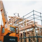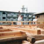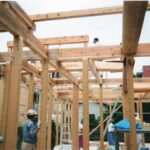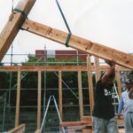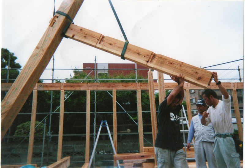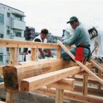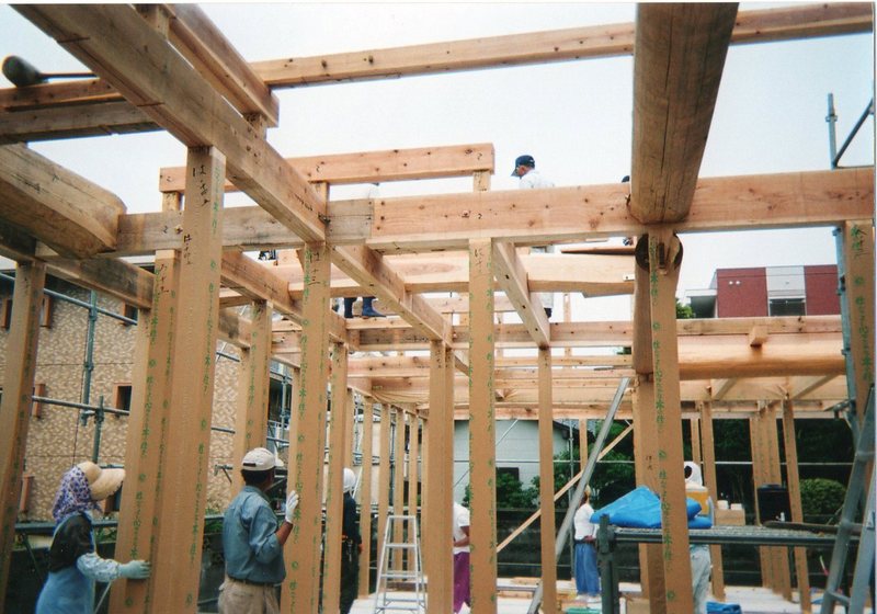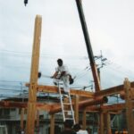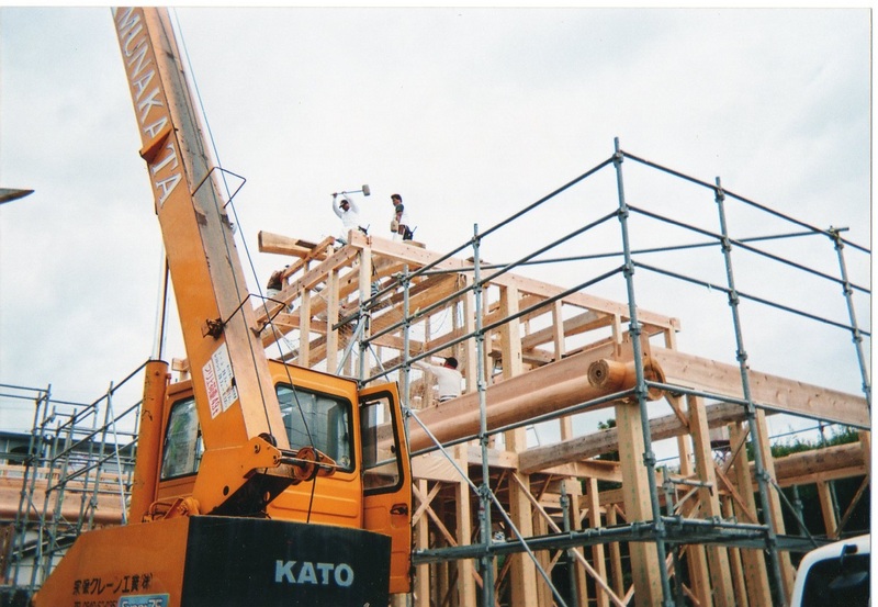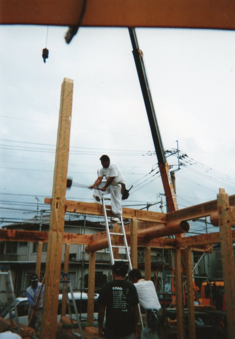 ②外回りがある程度建つと1番大事な八寸角の桧の大黒柱を胴差しを差した状態でクレーンで吊って建てます。
