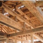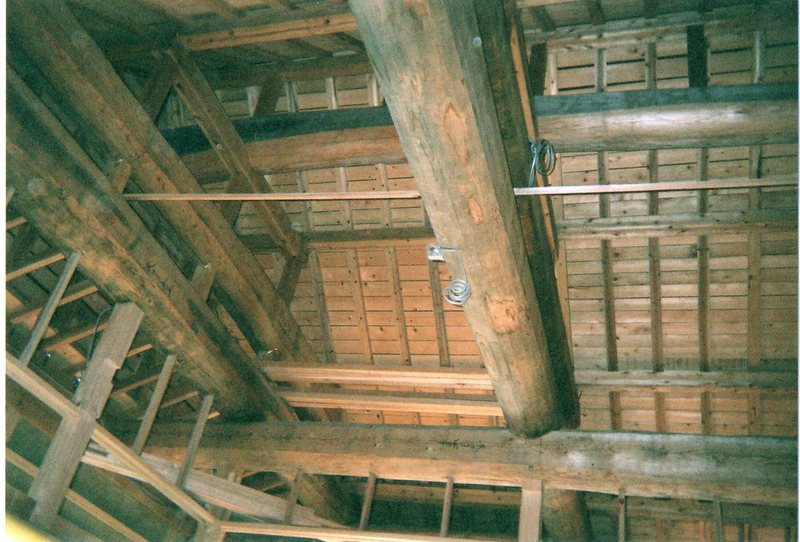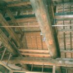 ⑪1階の大屋根を下から見た写真です。敷き梁や高梁が十字に組んでねじれの力に対応しています。