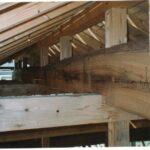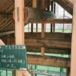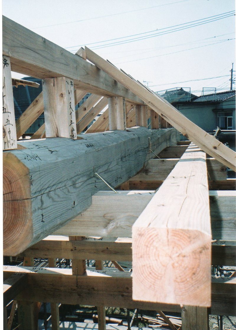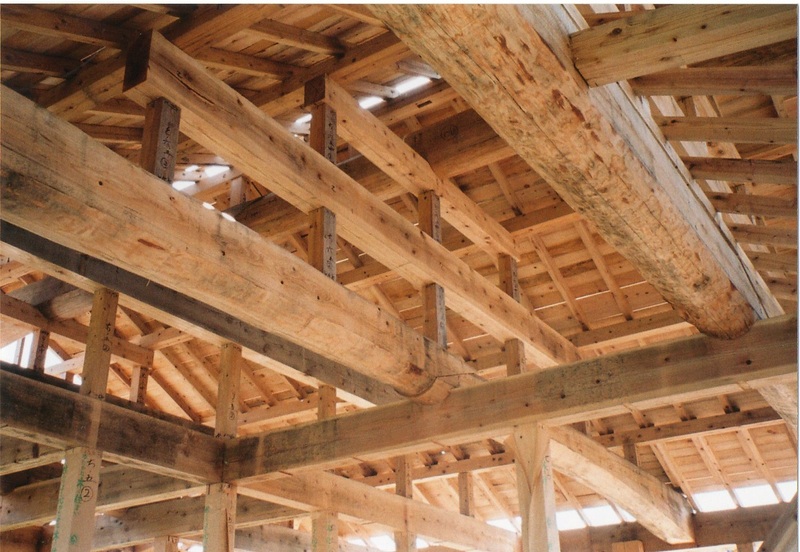 ⑨1階の大屋根の小屋組です。下から小屋梁、2重梁、三引き、高梁の写真です。やじろべぇ~のように上からの力を分散します。