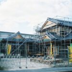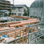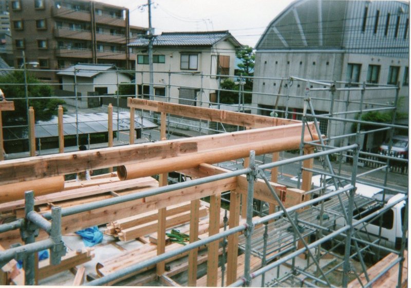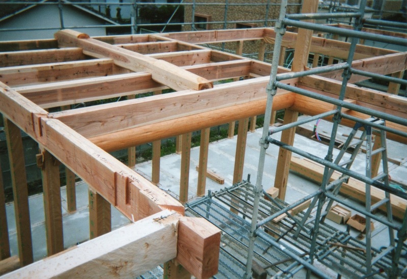 ①棟上の様子です。丸桁、桁などの外回りの横架材を建てて行きます。
