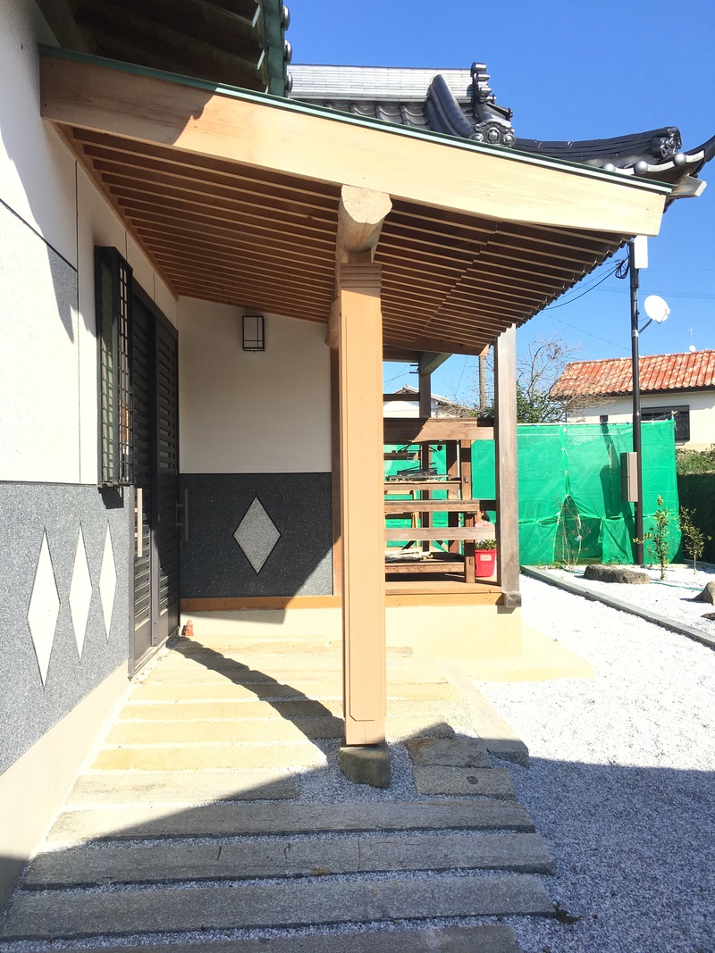 玄関庇は2m50cmほど出して南側の日差しや横なぐりの雨でもゆっくり傘をたためるほど庇が出ています。