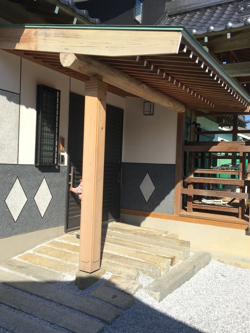左からげ玄関、付け入母屋(テラス)の上に大屋根に千鳥破風と複雑な屋根ですね。テラスでBBQをしたり雨が降っても洗濯物を干したり基礎の立上りを利用した露天風呂があり特に夏は頻繁に入ります。