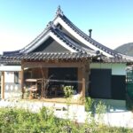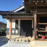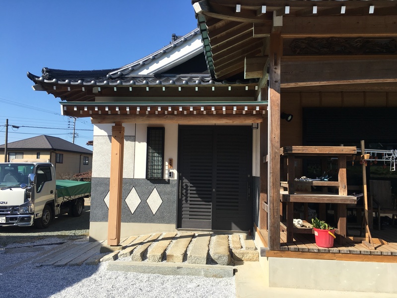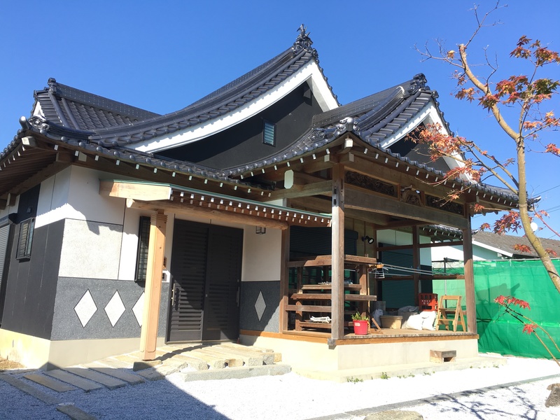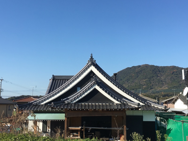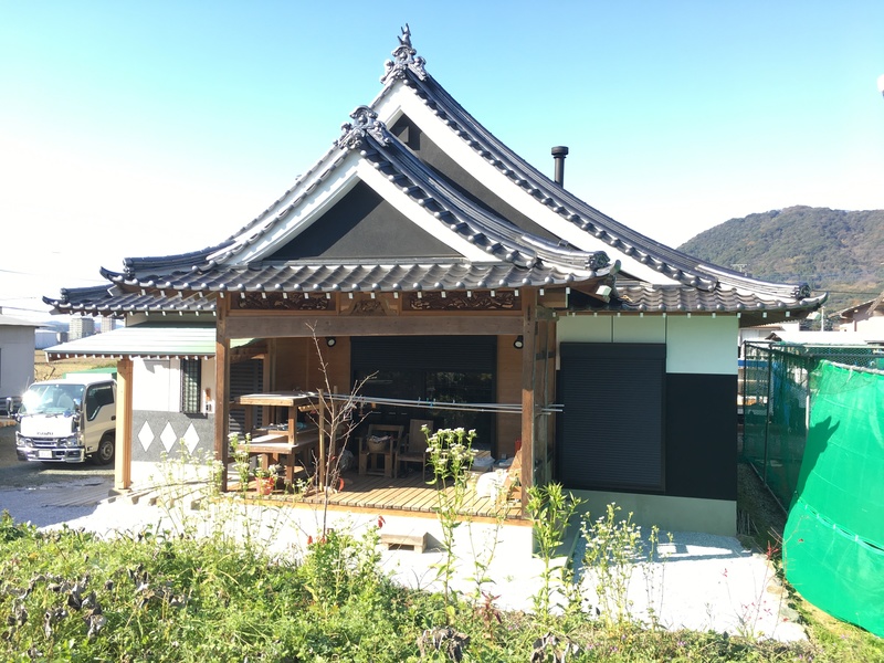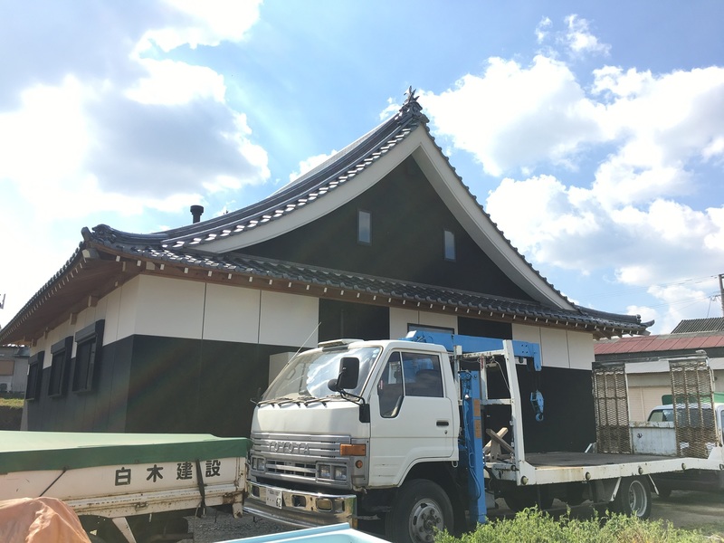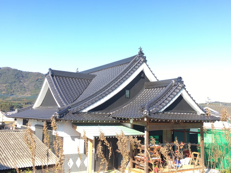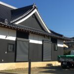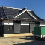 北側は大屋根をシンプルに反り屋根入母屋造りで仕上げ、廃棄ダクトが出ている壁は白漆喰だと汚れが目立つので黒の砂壁で仕上げました。