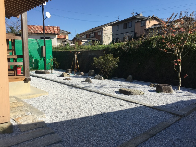 唯一の南側の庭は植木をあまり植えず庭石を配置し白砕石を敷き石庭に仕上げました。