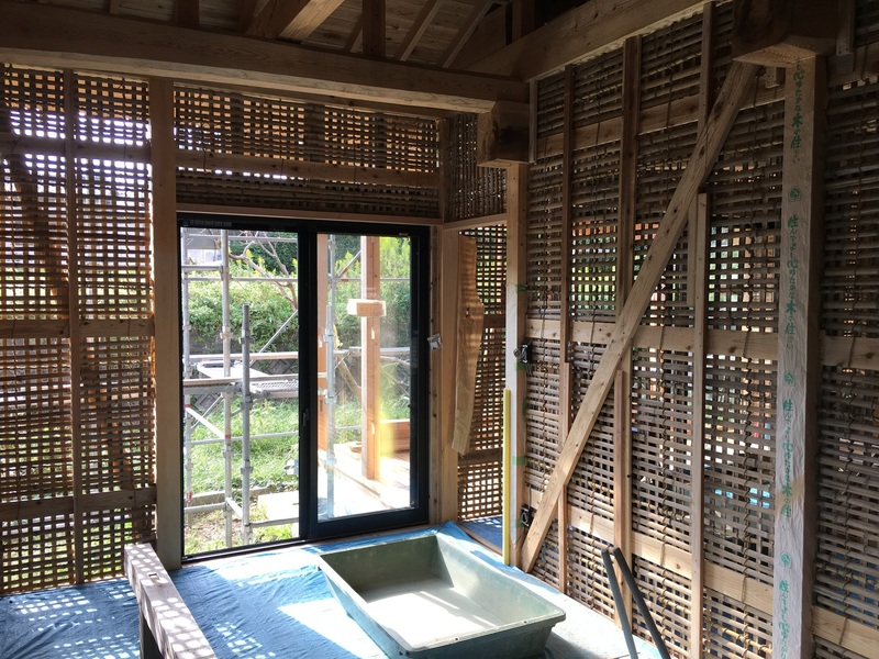 ⑰南東側の外壁に泥コンを下塗りした様子です。
